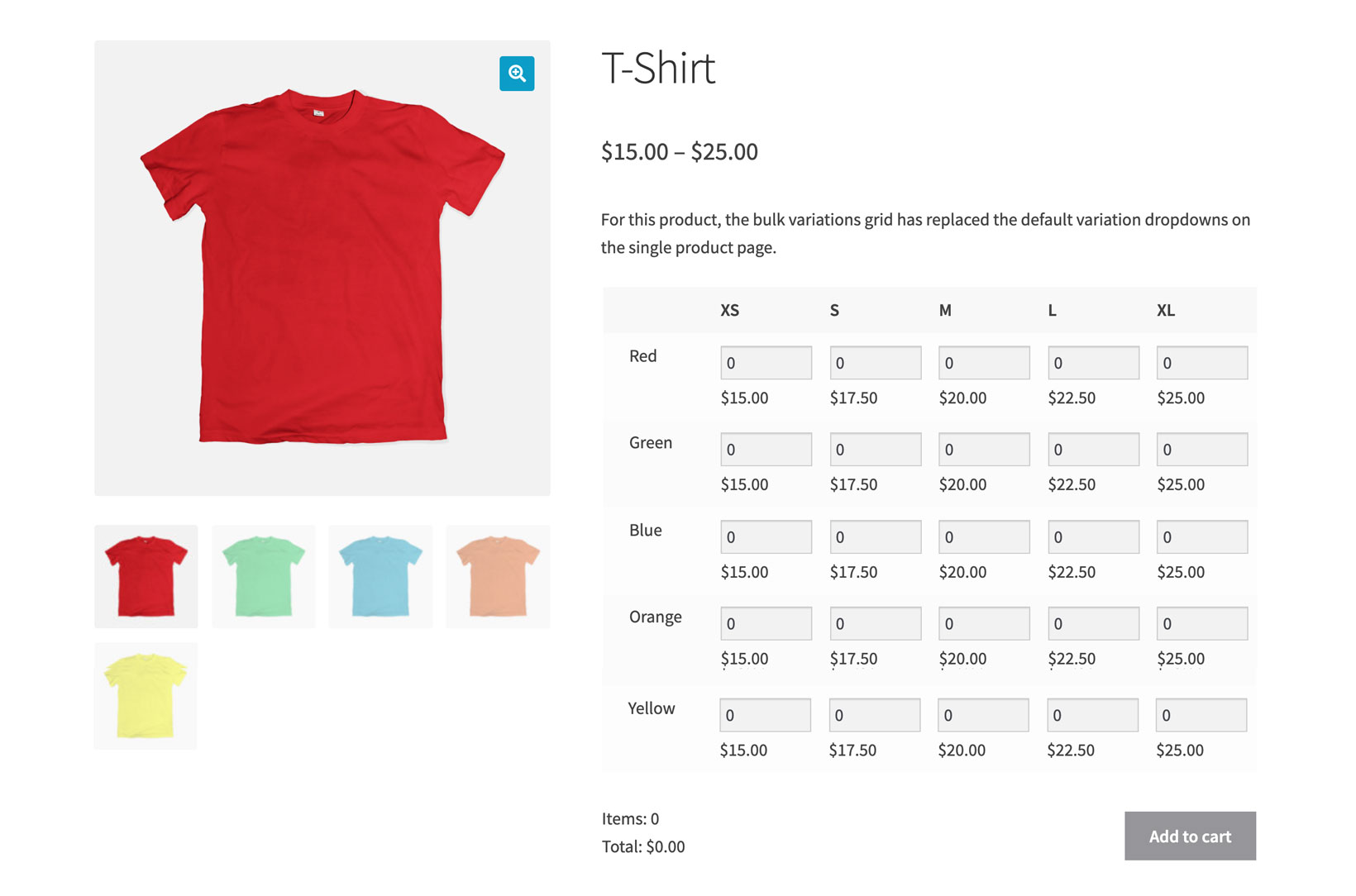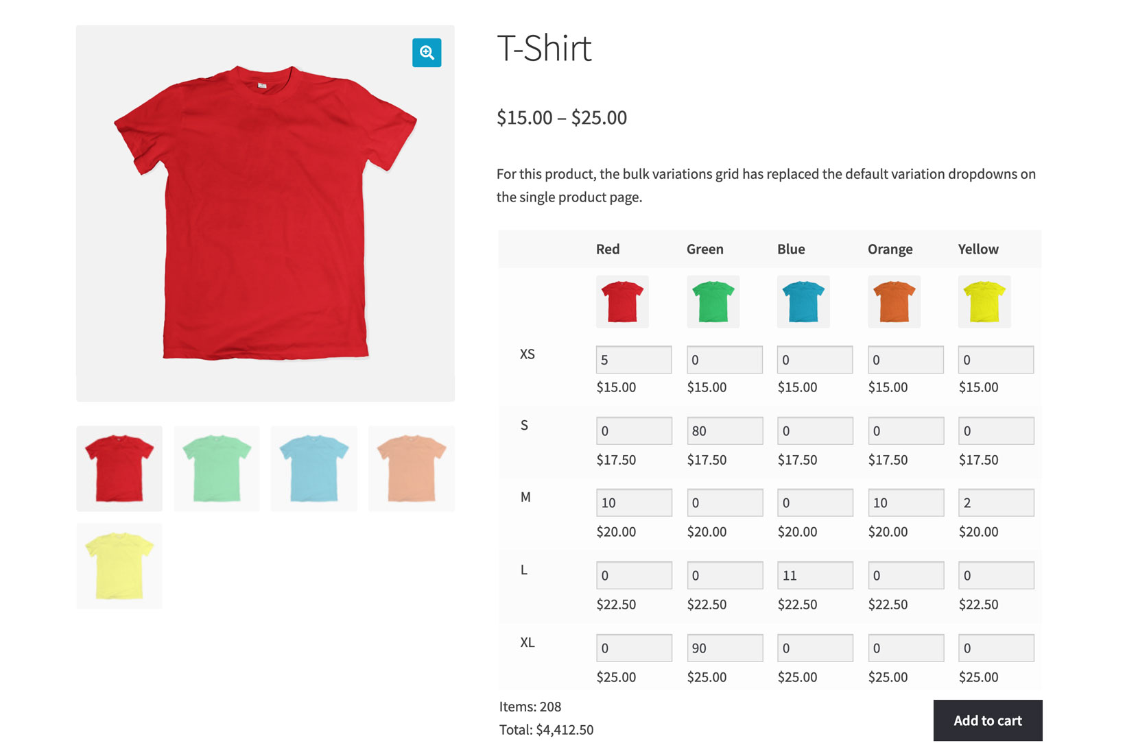 The grid will appear instead of the usual dropdowns, with the add to cart button underneath. If you don't want the grid to appear here, then you can manually add the variation grid to other locations on the single product page. Please see the article on creating variation grids.