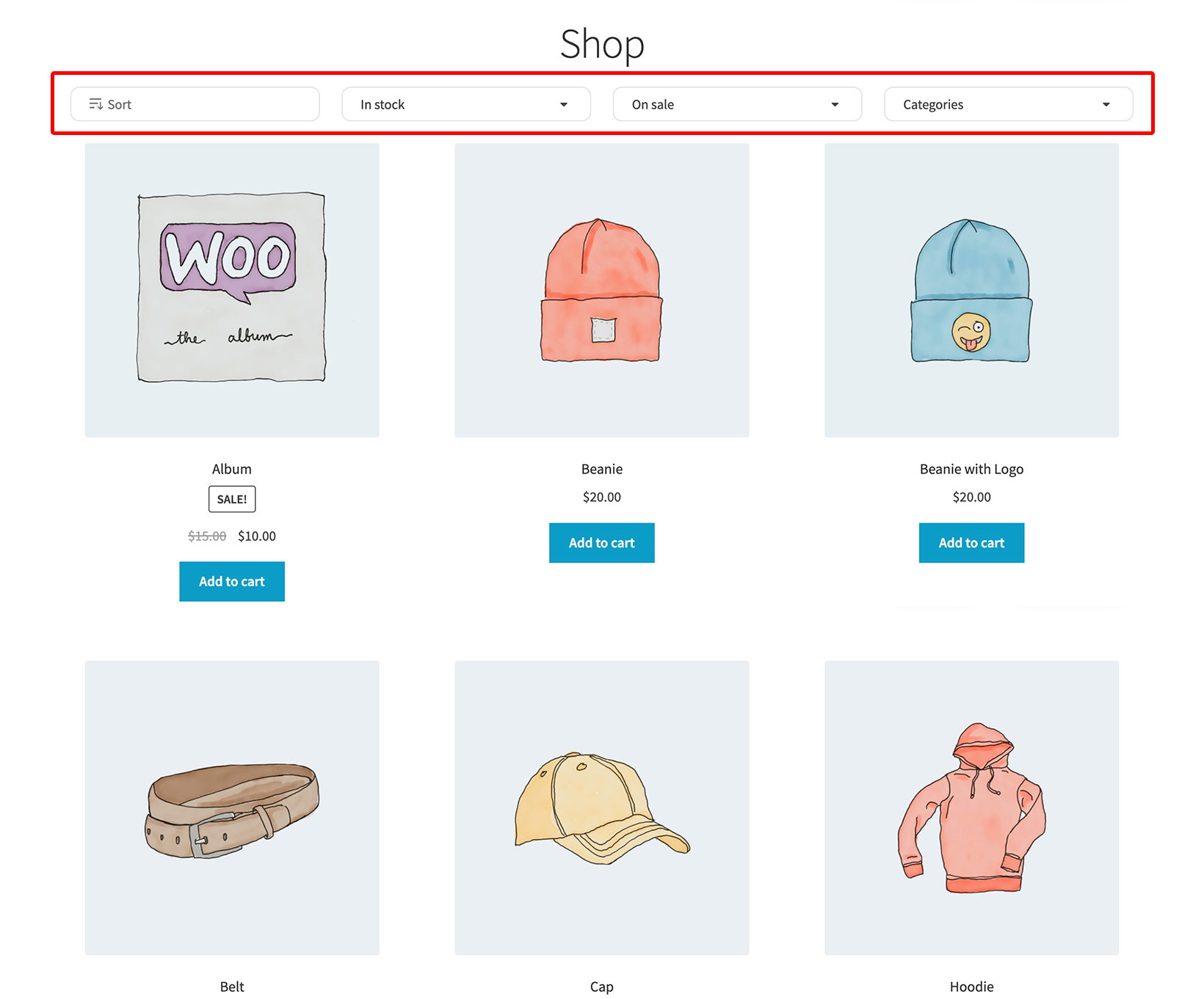 The filters will appear in a horizontal layout above the list of products. If you would prefer to add filters to pages manually, or to display them in a sidebar instead of horizontally, then you can do this. Simply leave this option blank and follow the instructions for adding filters to a page.