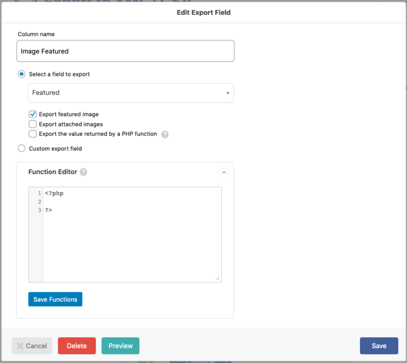 - If you use featured images then you can drag the Featured field from the Media > Image area on the right. After dropping it into the main area it will be labelled as Image Featured. Click on this field and a settings modal will open where you should ensure only the ‘Export featured image’ checkbox is checked and click Save.