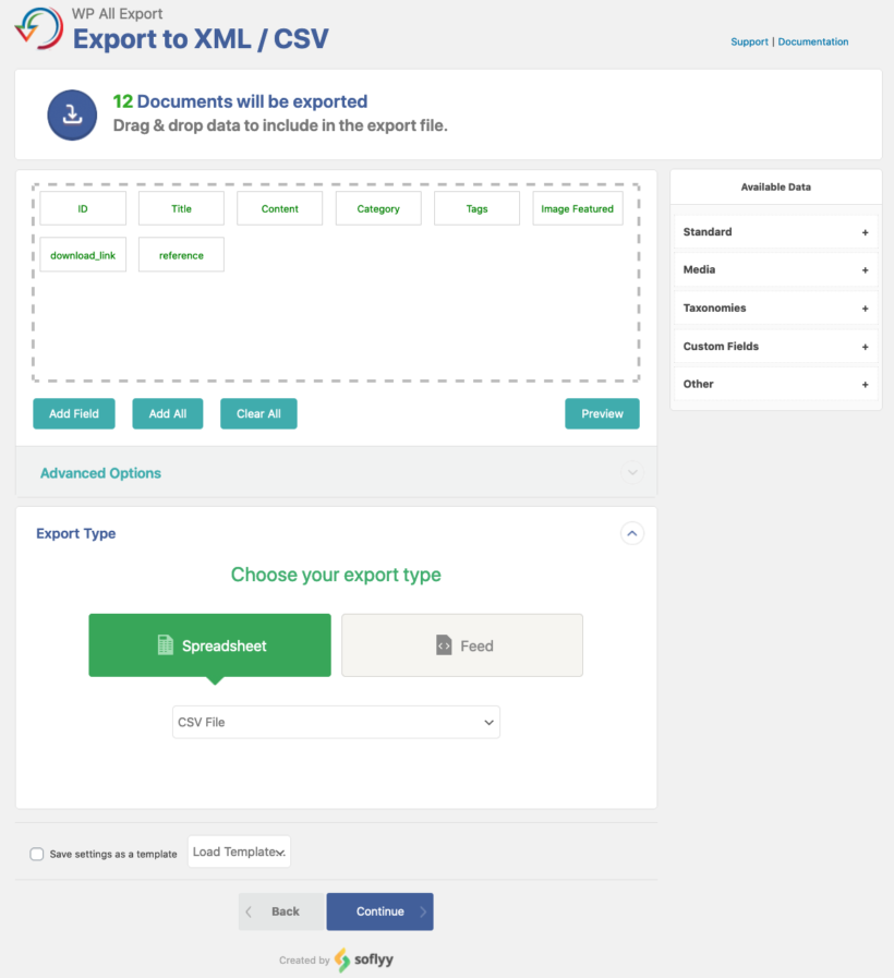 - Next make sure the Export Type to is set to Spreadsheet and CSV File in the dropdown and click the Continue button.