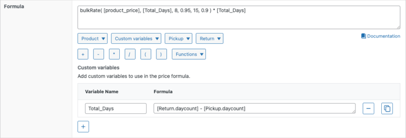 bulkRate( [product_price], [Return.daycount] - [Pickup.daycount], 8, 0.95, 15, 0.9 ) * ( [Return.daycount] - [Pickup.daycount] )