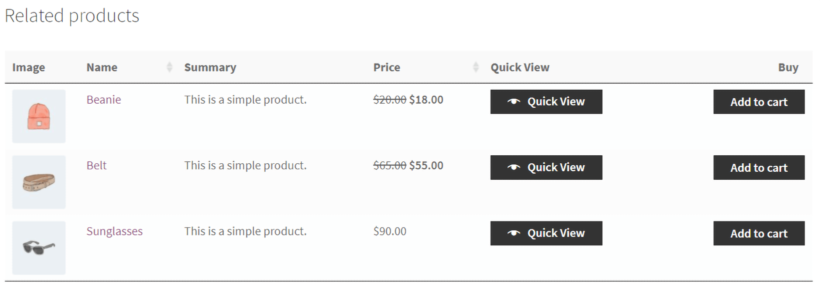 As well as adding WordPress Product Table via a shortcode or displaying them on the shop and category pages, we have provided a code snippet which will enable the product table layout wherever you display related products and upsells. These are the products that you select on the Add/Edit Product screen under Product Data → Linked Products. Upsells appear on the single product page, and cross-sells appear on the cart.